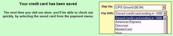 After a customer saves a card, the next time they visit your store, when they check out, the "Pay with:" menu will contain a new option labeled "Your saved credit card ending in " followed by the last four digits of the card number. If the customer chooses this option, they can complete their checkout with just two more clicks of the Continue button; they won't need to re-enter the card number, expiration date, etc.