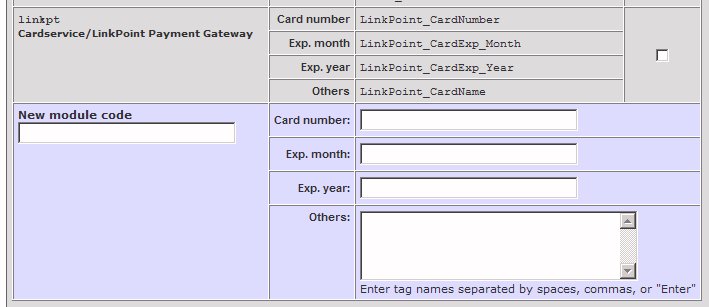 Upon installation, Card Magic is pre-loaded with information about many of the most popular payment modules that are used with Miva Merchant. This information is displayed in the Payment Modules table in the lower part of the settings page. If your module is listed in the table, Card Magic is ready to use; you don't need to add any data to the table. If your payment module is not listed in the table, you will need to enter the required data in the text boxes at the bottom of the table.