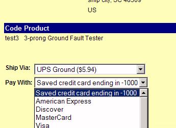 <SELECT NAME="PaymentMethod"><OPTION VALUE=""><Select One></OPTION> <OPTION VALUE="mod10:American Express">American Express</OPTION><OPTION VALUE="mod10:Discover">Discover</OPTION><OPTION VALUE="mod10:MasterCard">MasterCard</OPTION><OPTION VALUE="mod10:Visa">Visa</OPTION> <OPTION VALUE="cod:COD">COD</OPTION> </SELECT>