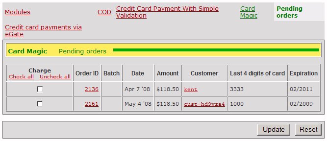 Note that some payment modules, such as the Miva "Simple Validation" module, do not actually charge credit cards; they just save the card number and other information so that you can manually process it later. These modules can be used with Card Magic. If you are using such a module, while reading this document, keep in mind that for your store, "charging the card" just means storing the information so you can view it later.
