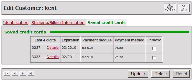 In the Customers section of the Miva admin, Card Magic adds a new "tab" link at the top of the right-side frame, labeled Saved credit cards. This link displays a list of all credit cards that the customer has saved. For each card, the list displays: